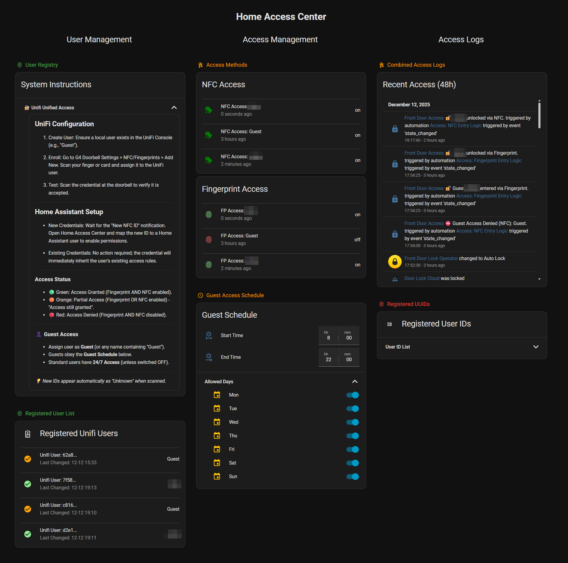 Centralized management interface for Unifi Access users, credentials, and guest schedules.
