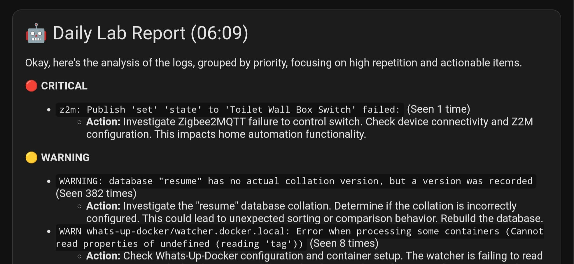 This system runs automatically every morning at 7:00 AM. 1. Trigger: The system wakes up and sends a "Start" command to a remote server. 2. Analysis: The remote server (running a specialized AI Reporter) reads the logs from the past 24 hours. It looks for errors, warnings, and unusual patterns. 3. Reporting: Once finished, the remote server sends a summary back to Home Assistant. 4. Notification: You receive a notification on your phone (and a persistent message in the dashboard) summarizing the health of your smart home.